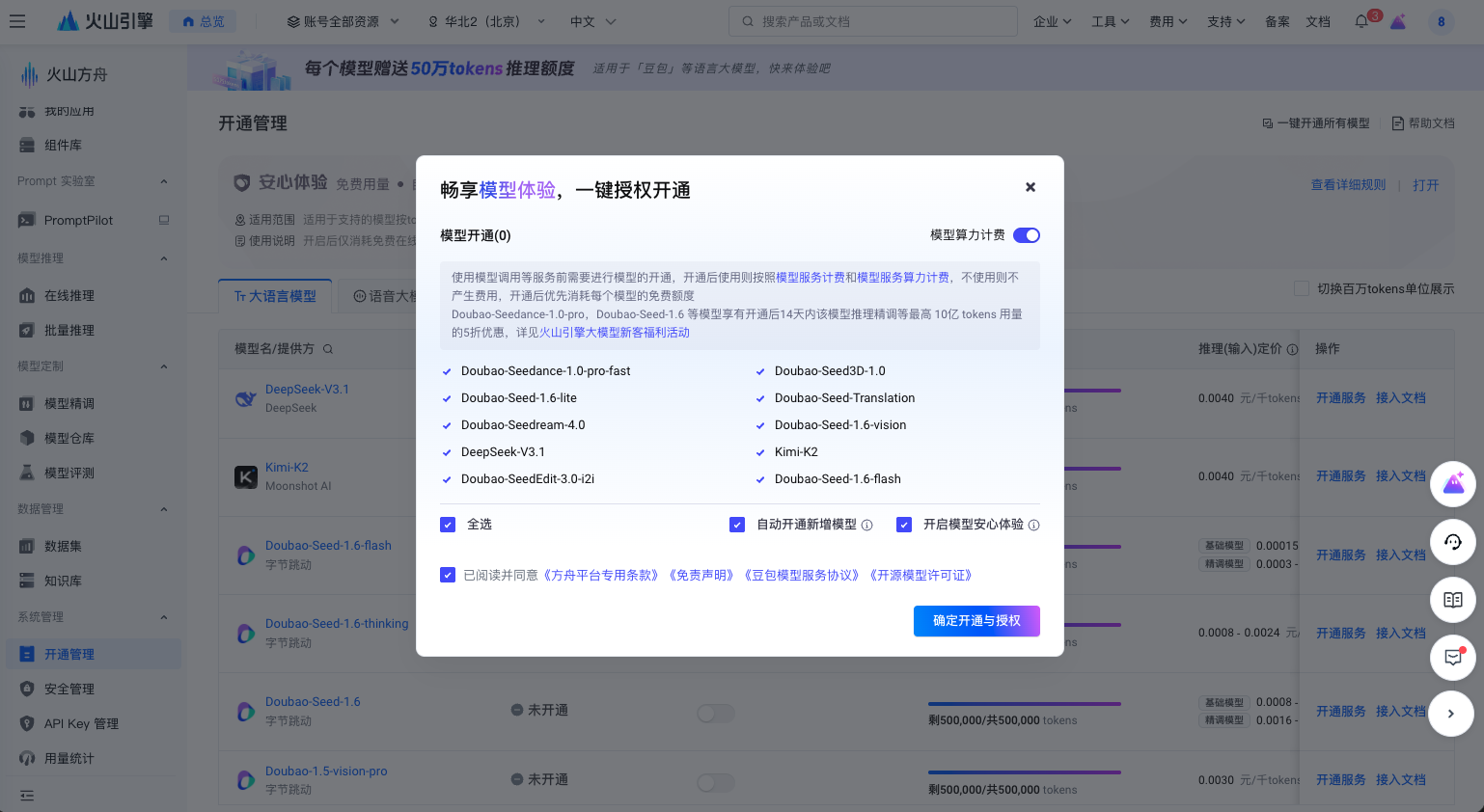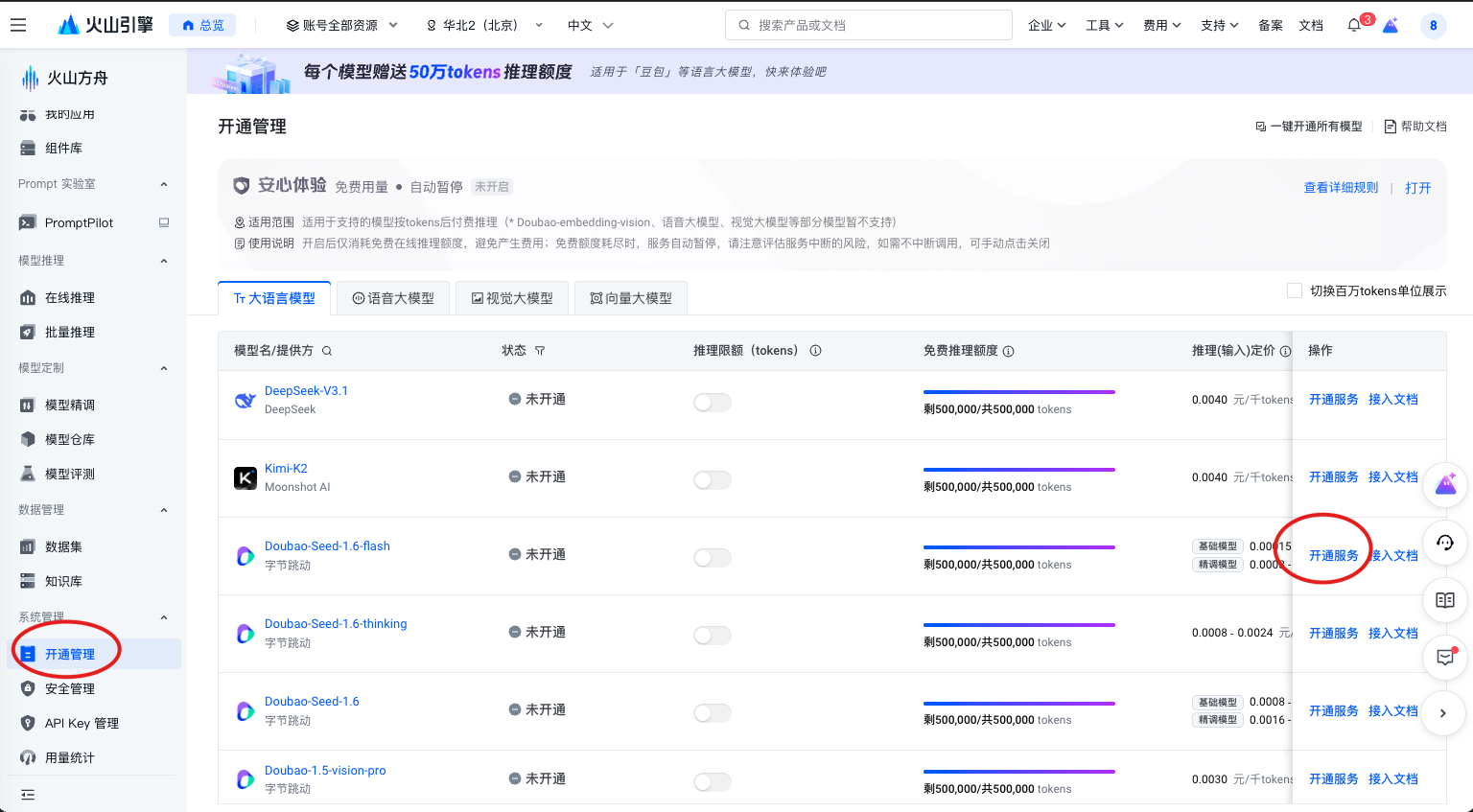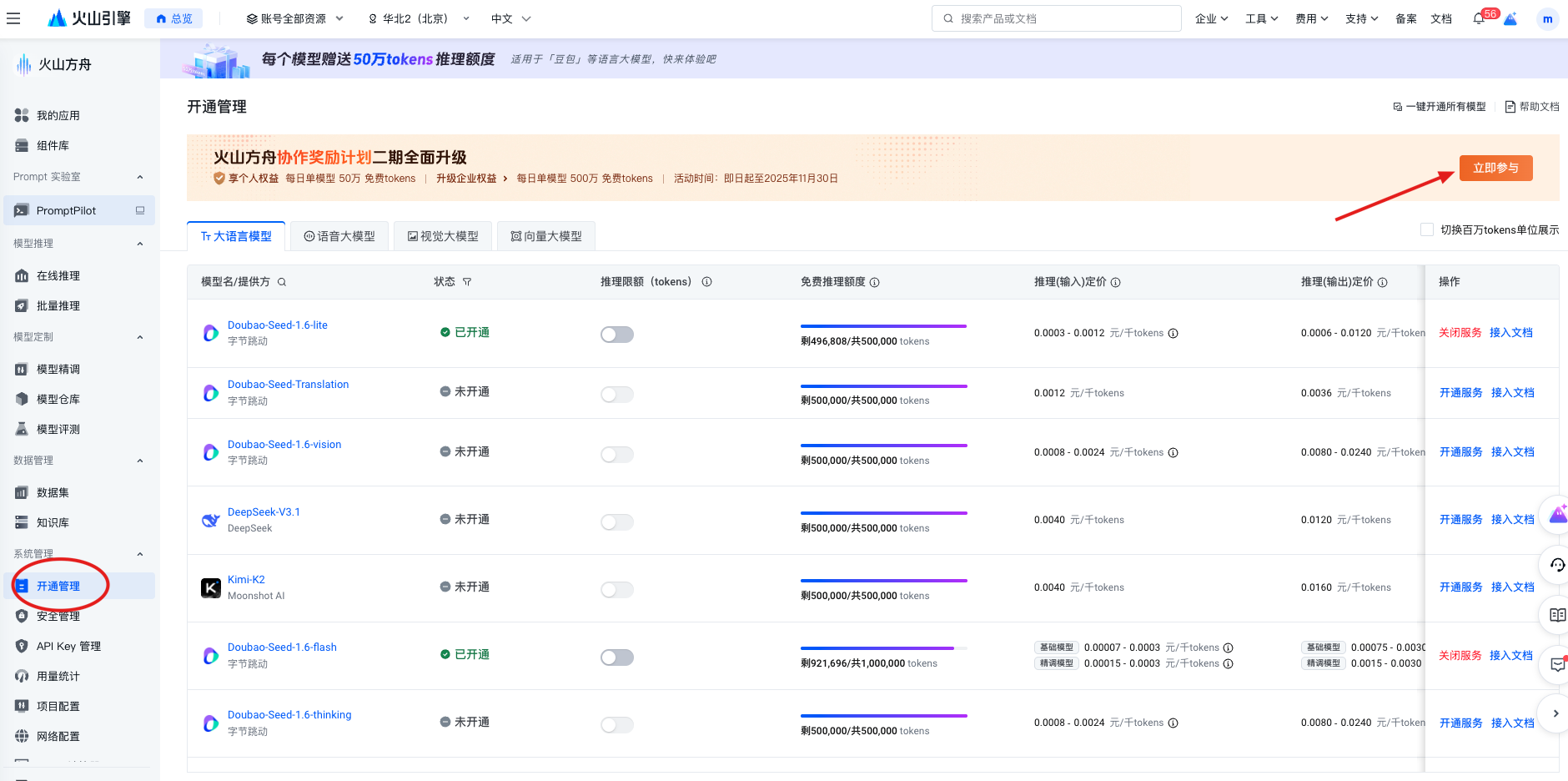 入口在火山引擎控制台-开通管理:https://console.volcengine.com/ark/region:ark+cn-beijing/openManagement