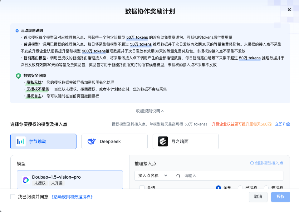 不介意隐私的场景,可以采用「数据协作计划」每天免费使用 50W tokens。