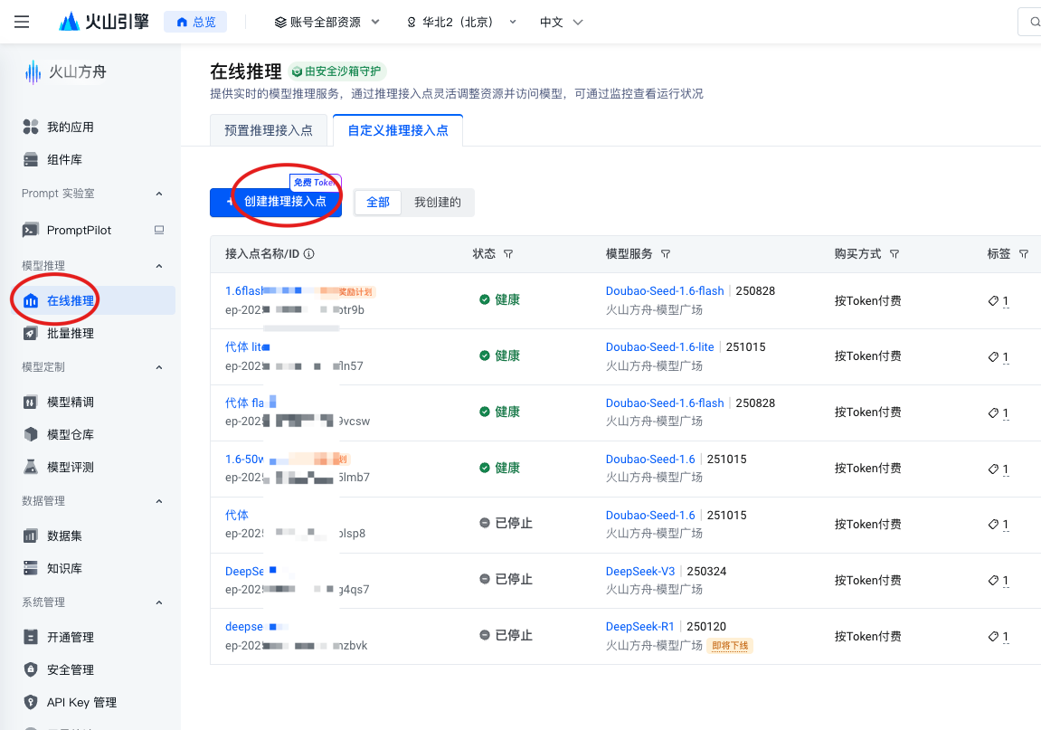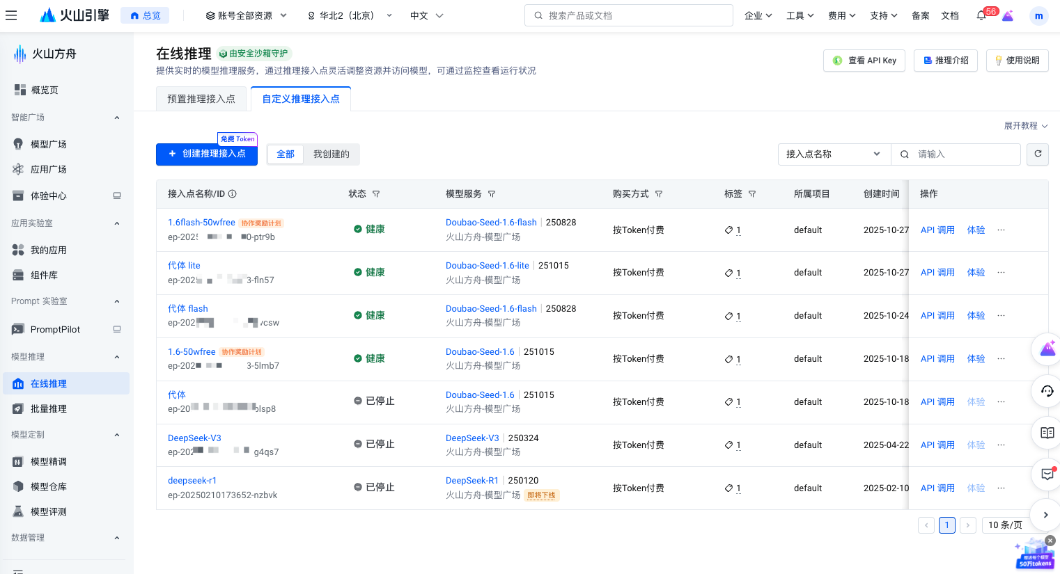 在线推理页面:https://console.volcengine.com/ark/region:ark+cn-beijing/endpoint?config=%7B%7D