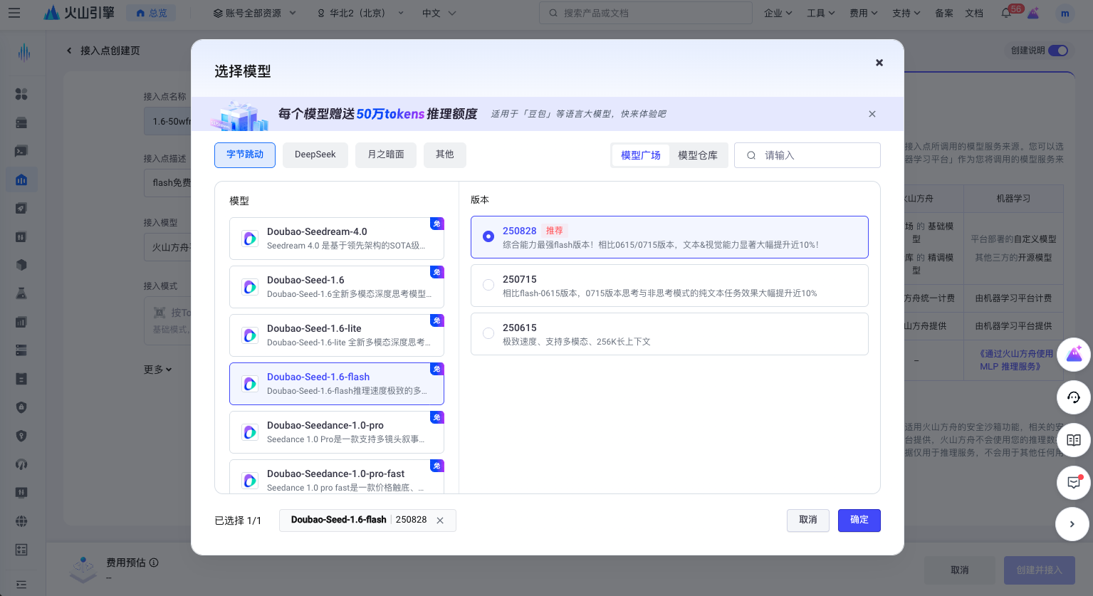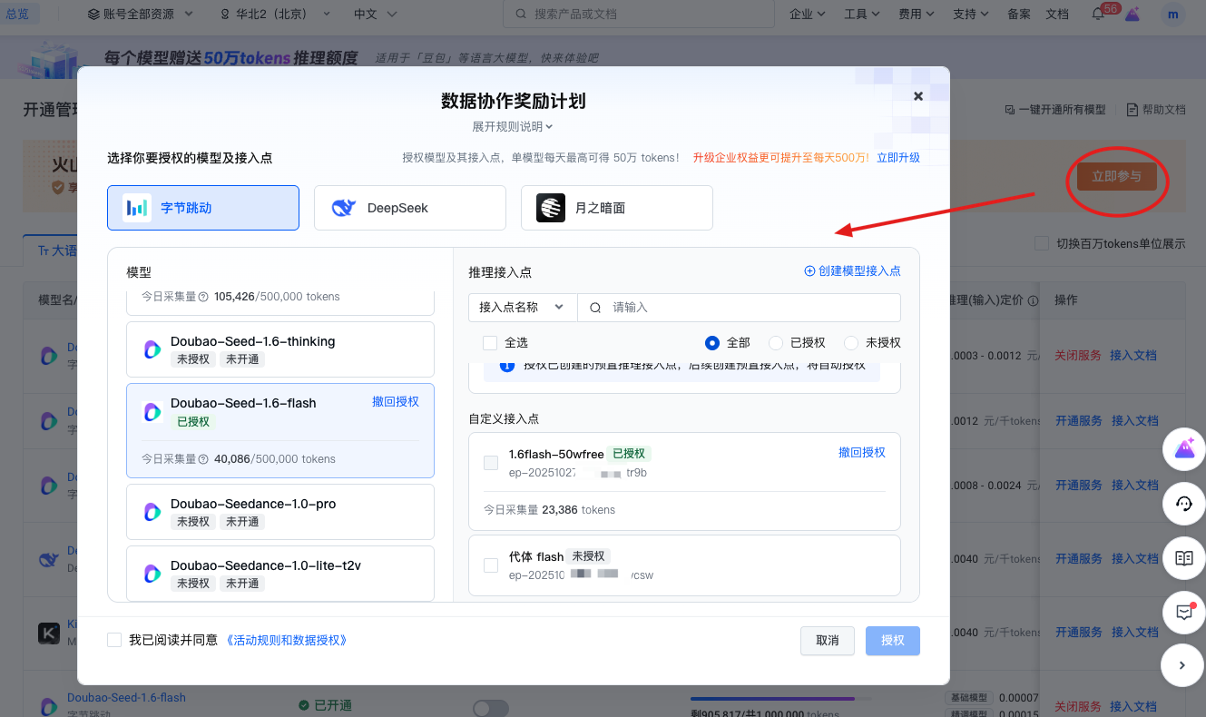 点击立即参加,可以选择授权的模型,然后在右侧选择授权的接入点。