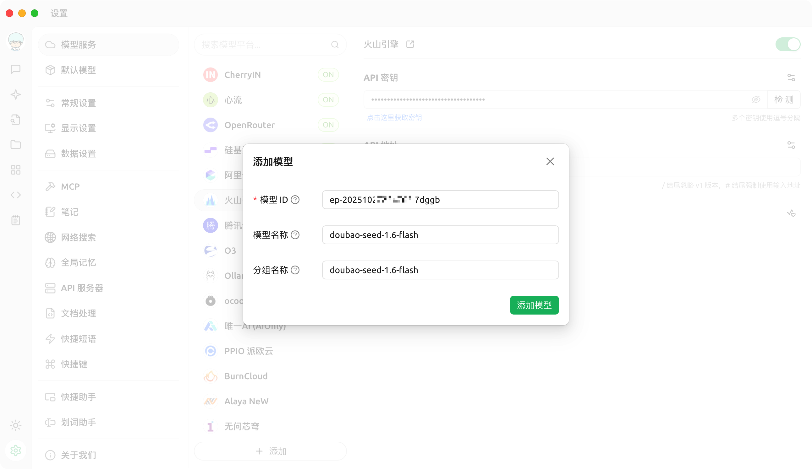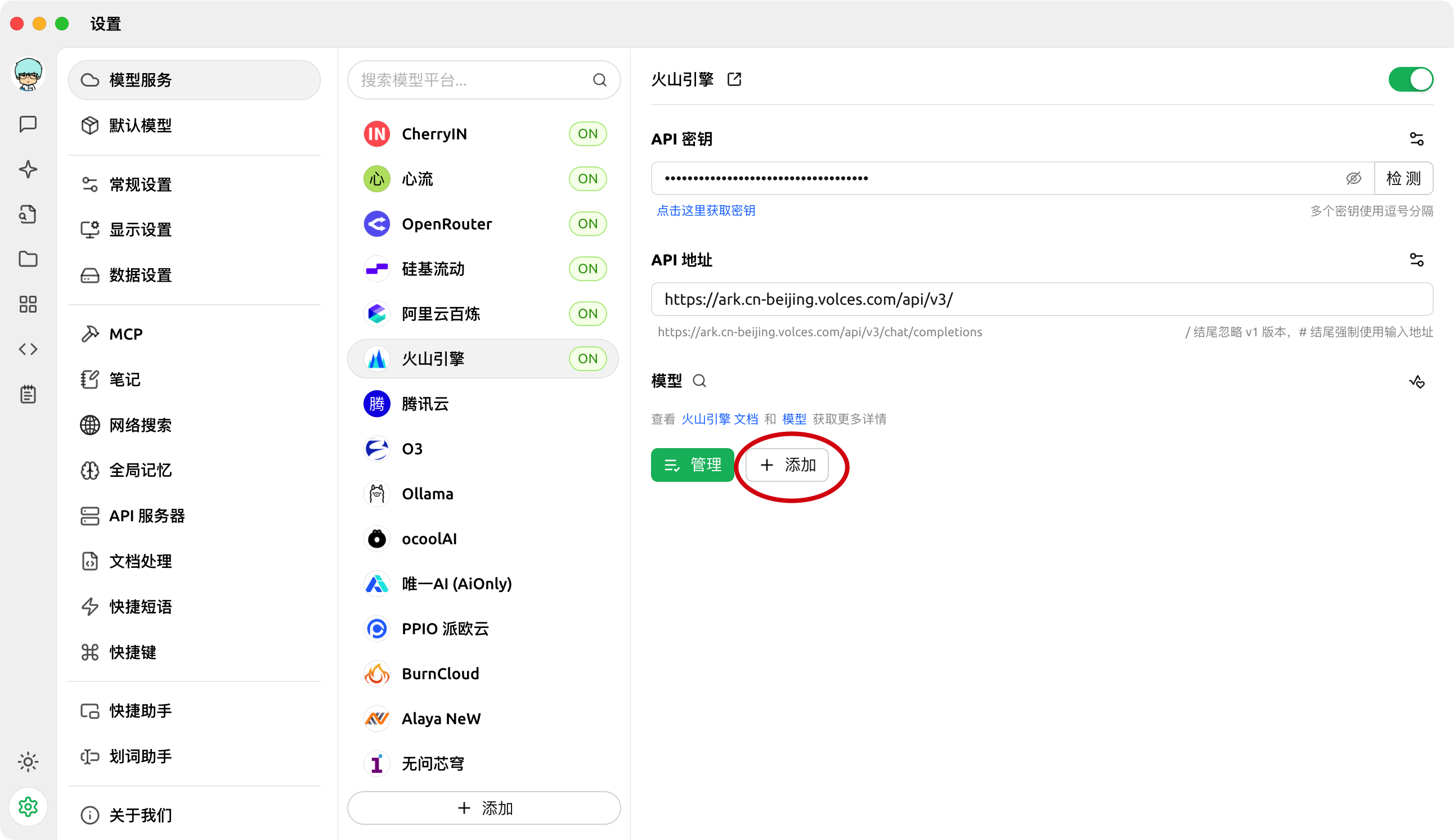在 Cherry Studio 中设置「火山引擎」,这里也可以添加前面的接入点使用。
