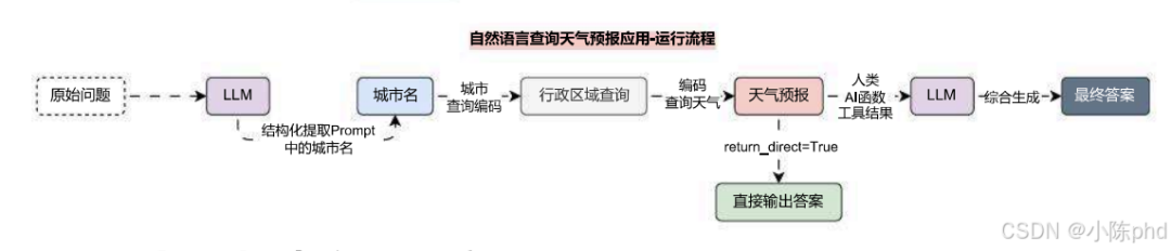 所以要完成一个输入 城市名 查询天气预报的函数/工具,必须先调用 行政区域查询 将城市转换为城市编码,然后在利用城市编码调用 天气预报 接口,从而完成整个流程,如下