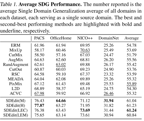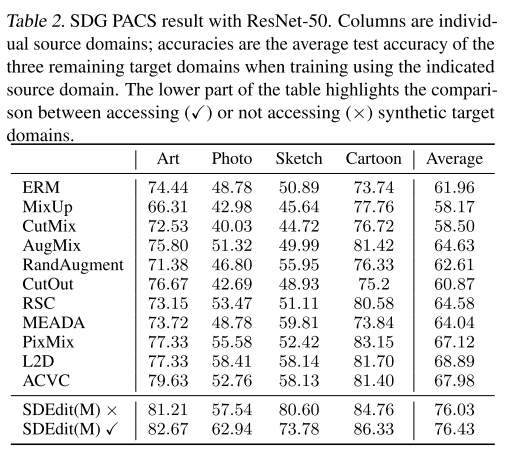 论文做了一个有趣的实验:在不生成目标测试域数据的情况下(SDEdit(M)×),仍然显著超过基线方法,仅比使用目标域的版本略差