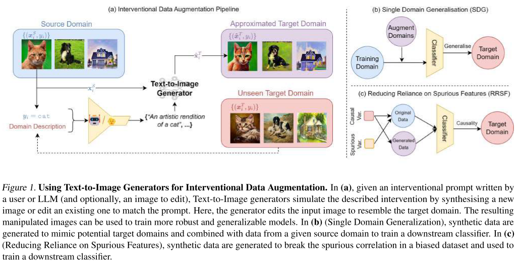 探讨了利用文本到图像(T2I)生成器进行介入性数据增强的方法,以提高图像分类器在环境变化下的鲁棒性。针对单域泛化(SDG)和减少虚假特征依赖(RRSF)任务,研究系统评估了提示策略、条件机制和后处理过滤三个维度的影响。实验结果表明,现代T2I生成器(如Stable Diffusion)作为数据增强机制显著优于传统方法,其中纯文本生成方式表现最佳,且简单提示往往足够有效。该研究为数据增强提供了新范式