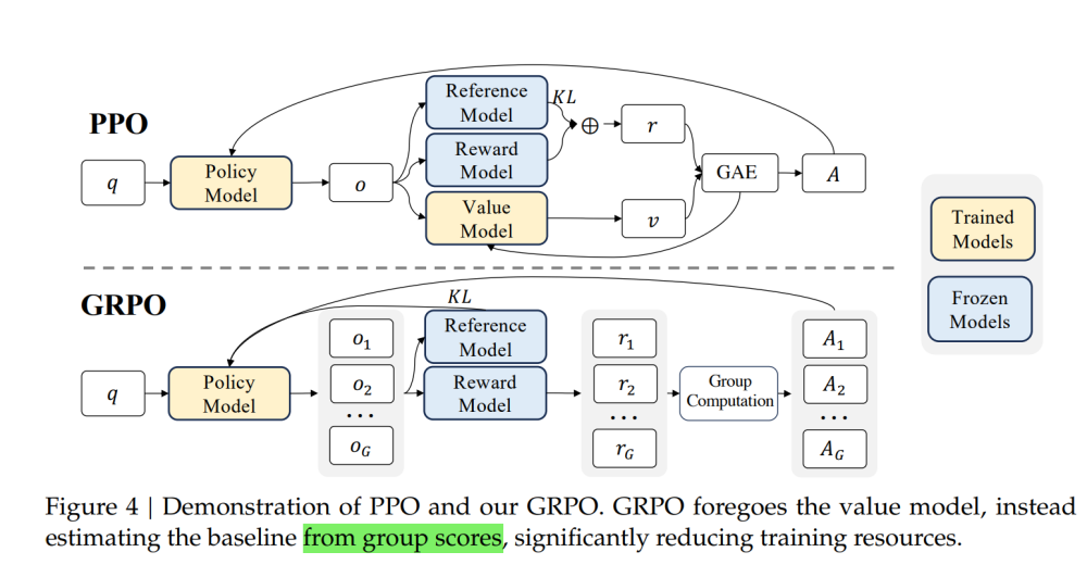 相比传统的 RLHF(基于强化学习的对齐方式),GRPO 不需要额外训练一个 reward model,而是通过 成组样本比较 的方式来决定哪些输出更优,从而引导模型参数的更新。这使得它在效率、稳定性和实现难度上,都有一定优势。