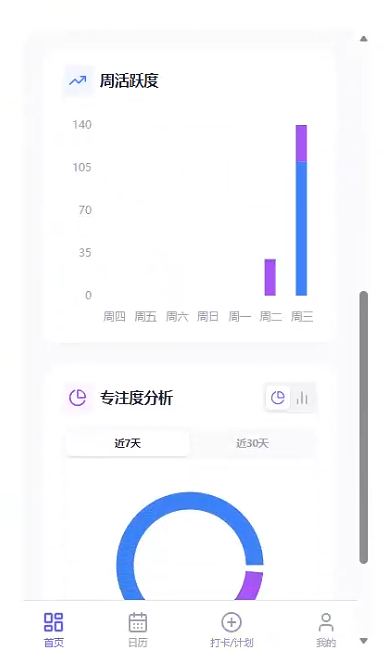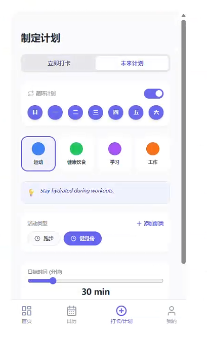 上面是我的计划,可以循环安排,也可以选择具体的日期,打卡的话可以根据计划来,也可以灵活记录,打卡成功后在主界面会有相关的数据展示,这对于我来说比现在市面上有日记打卡软件方便灵活多了,关键还不用担心隐私泄漏。