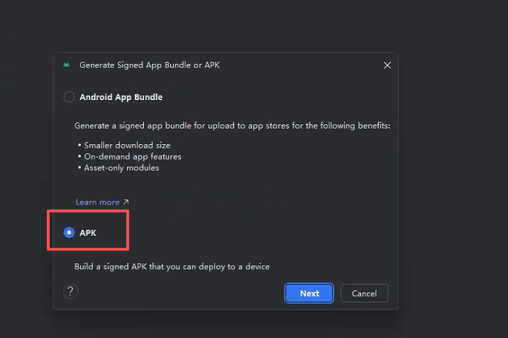 在 Android Studio 中,通过 Build > Generate Signed Bundle / APK 打开向导。