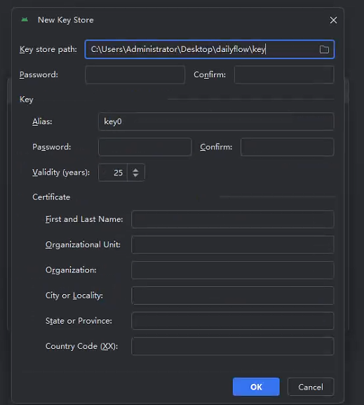 填写并牢记所有密码字段,有效期建议 25 年以上。