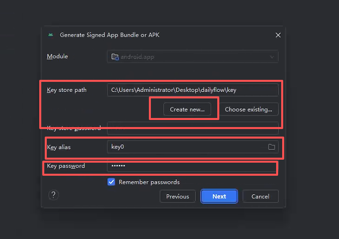 在签名向导中,选择你刚创建的或已有的密钥库。