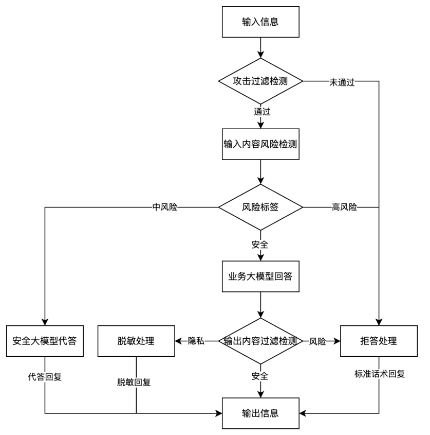 3.4 对业务模型回答的内容实现风险过滤,如果存在敏感信息进行脱敏处理。如果存在风险内容,进行拒答回复。如果安全进行信息内容输出。