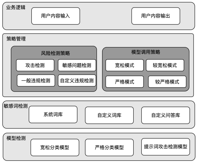 - 风险词库构建:通过对风险词库和风险提示词库构建,形成外层拦截体系,保证对内容的初次风险判别。