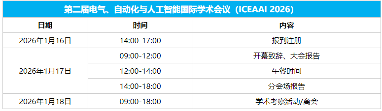 为了探索这些领域的最新成就与未来趋势,2026年第二届电气、自动化与人工智能国际学术会议(ICEAAI 2026),定于2026年1月16-18日在中国广州举行。 ICEAAI 2026将邀请行业内知名专家学者进行主题报告,预计包括但不限于口头报告、海报展示、技术展览等多种形式,旨在促进参会者之间的交流与合作,我们衷心欢迎全球范围内的行业专家、学者踊跃参与ICEAAI 2026,共同见证和探索,电气、自动化与人工智能领域的未来发展趋势。