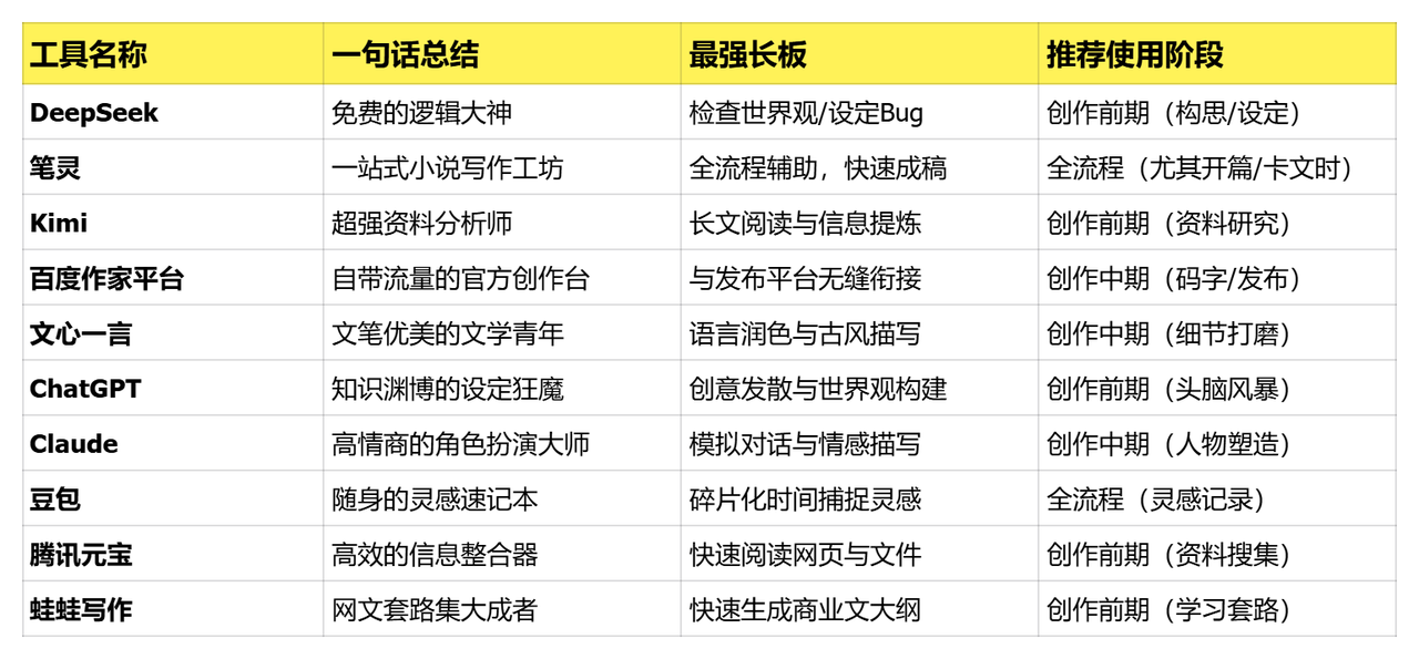 📊 10款AI写小说工具对比速览表