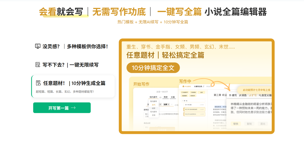 这个必须放前面说,因为它太懂我们写小说的人需要什么了,像一个集合了多种工具的AI写小说软件生成器。