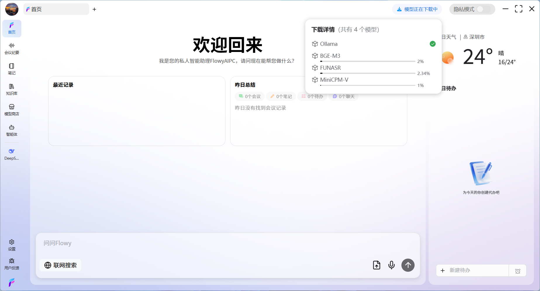 首次进入FlowyAIPC会有一个下载本地模型的弹窗提示,点击 “快速下载” 即可