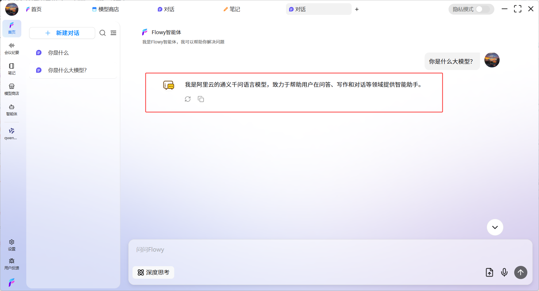 模型下载好后,在 FlowyAIPC左侧菜单栏的模型切换区域,选择你刚才下载的本地模型