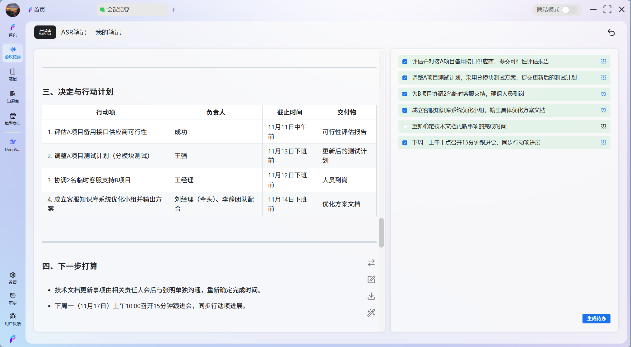 - 会议纪要:实时录音 → 转写 → 自动生成总结