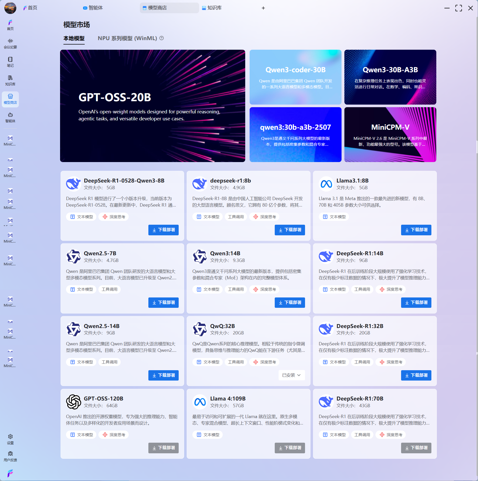 FlowyAIPC会根据你电脑的 CPU / 显卡 / 内存 /NPU 推荐合适的模型,点击下载按钮即可。 FlowyAIPC 会自动完成本地部署,不需要任何技术操作。