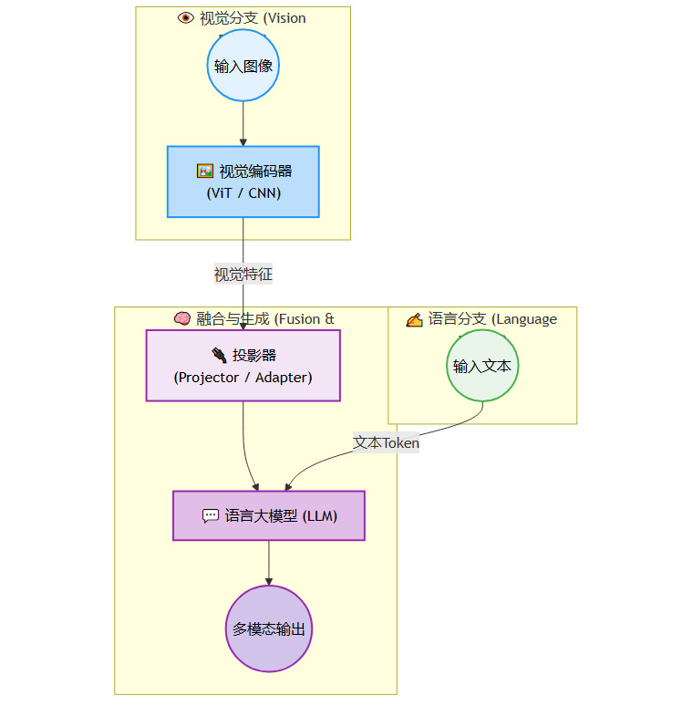 投影器 (Projector):这是一个相对轻量的网络,如多层感知机(MLP)或更复杂的Q-Former。它的核心任务是扮演“翻译官”的角色,将视觉编码器输出的特征向量,从视觉特征空间映射到语言模型能够理解的文本特征空间。