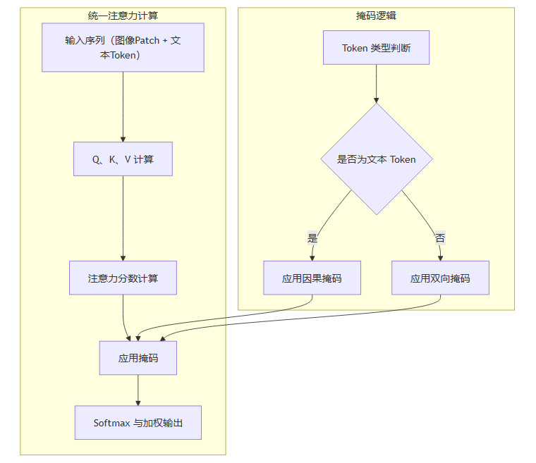 在统一的注意力计算框架下,如何兼顾文本生成和图像理解的不同需求?文本生成要求模型遵循因果关系,即在预测下一个词时,只能看到前面的词。图像理解则希望模型能看到整张图片,捕捉全局的上下文信息。