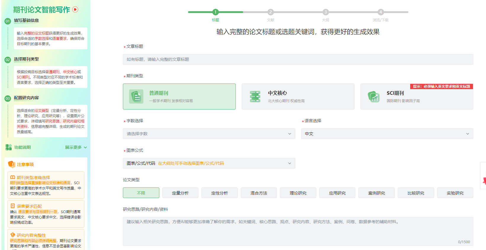 用户需输入完整论文标题(如“LC型并网逆变器恒功率控制方案研究与设计”),选择学历对应字数(本科3000字/硕士5000字/博士8000字),并指定语言(中/英文),确保内容深度与期刊要求匹配。 - 期刊类型三重适配