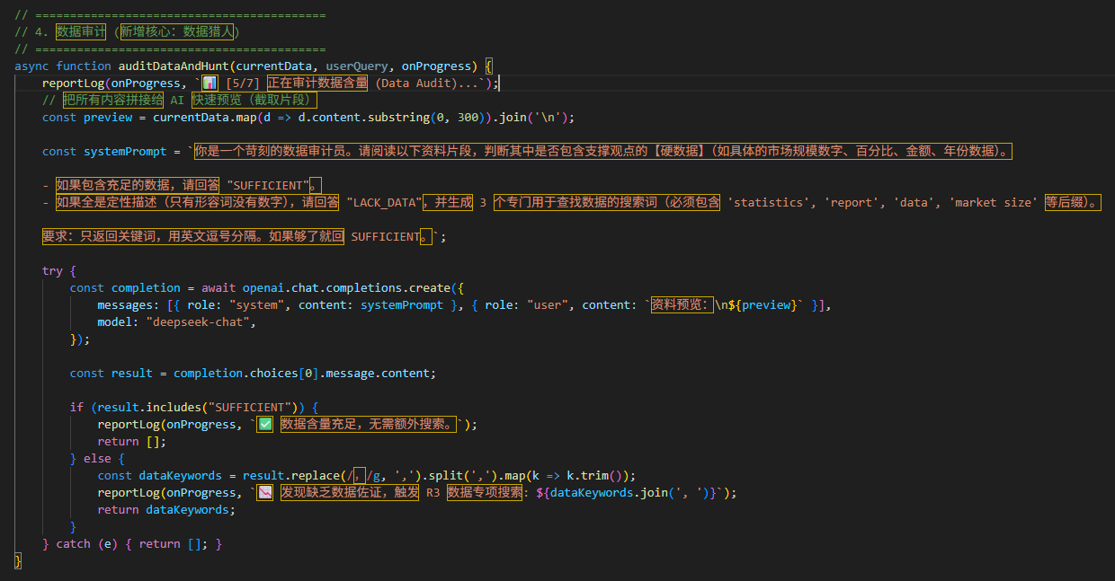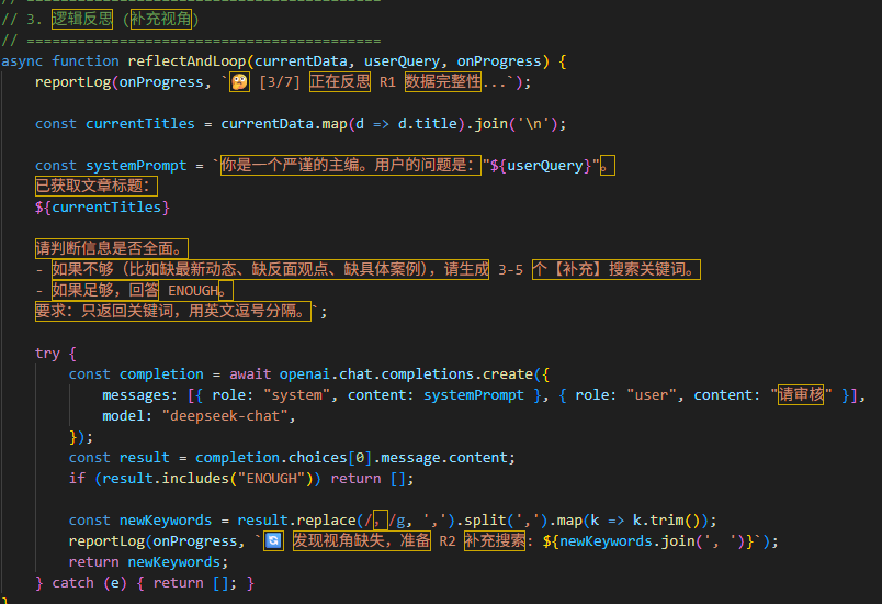 决策:如果缺失,生成补充关键词,触发第二轮搜索;如果足够,跳过。