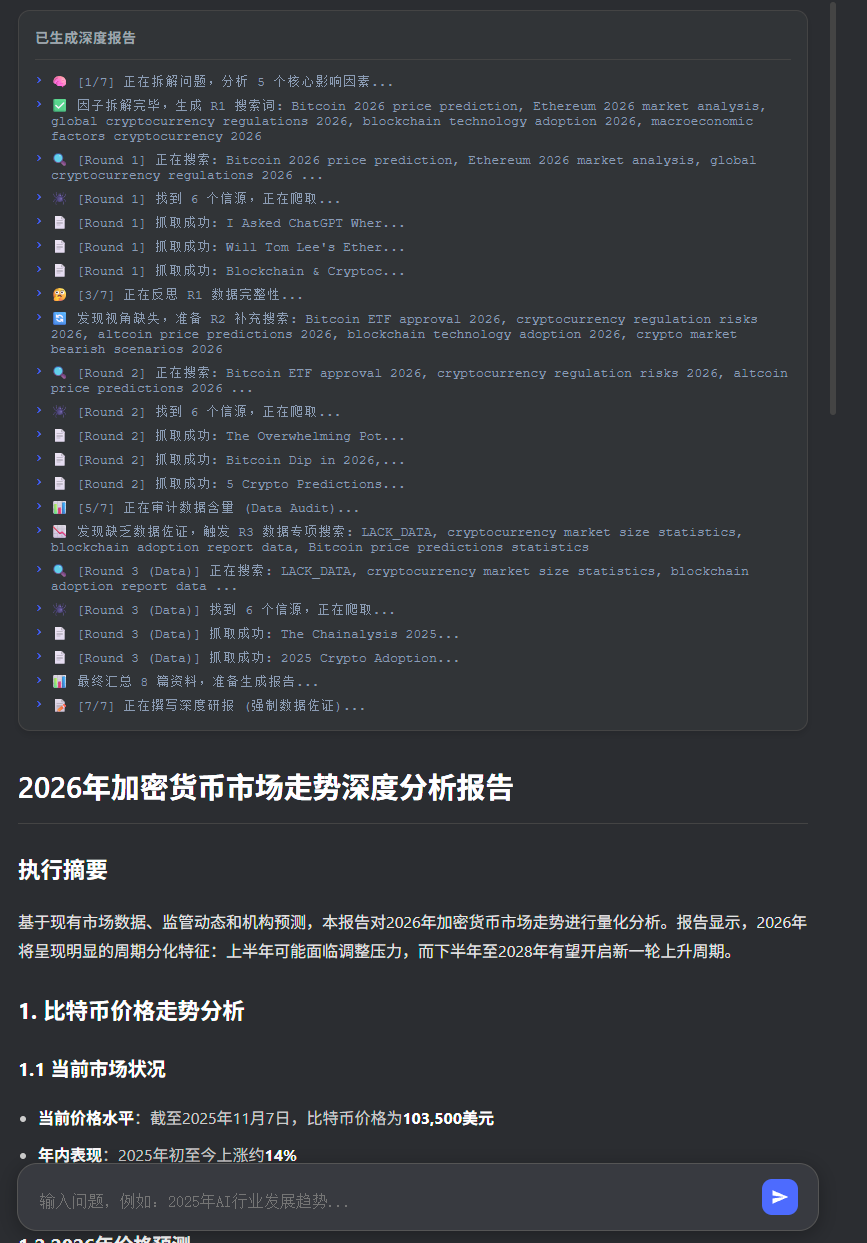 它不只是一个搜索工具,它能像人类分析师一样:拆解问题 -> 搜索信息 -> 反思不足 -> 补充搜索 -> 审计数据 -> 输出研报。