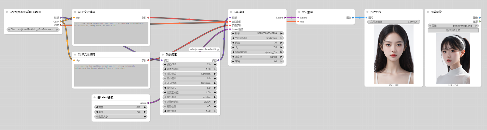 - 节点组合:Load Model(RealVisXL_V5.0_Lightning_fp16) → DynamicThresholdingNode → KSampler → BMAB After Detailer → Save Image,根据这个预设流程,先加入DynamicThresholdingNode,下一节再做BMAB After Detailer精修处理;