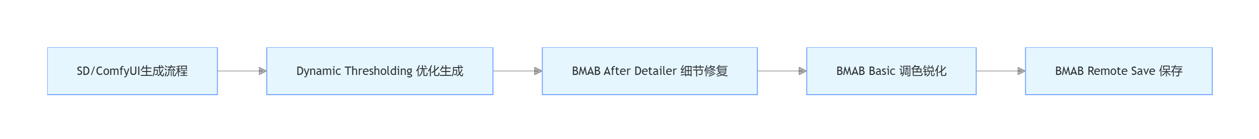 DT 功能负责「生成阶段的阈值优化」,BMAB 节点负责「生成后的细节修复」,形成 “生成优化→细节强化” 的闭环: