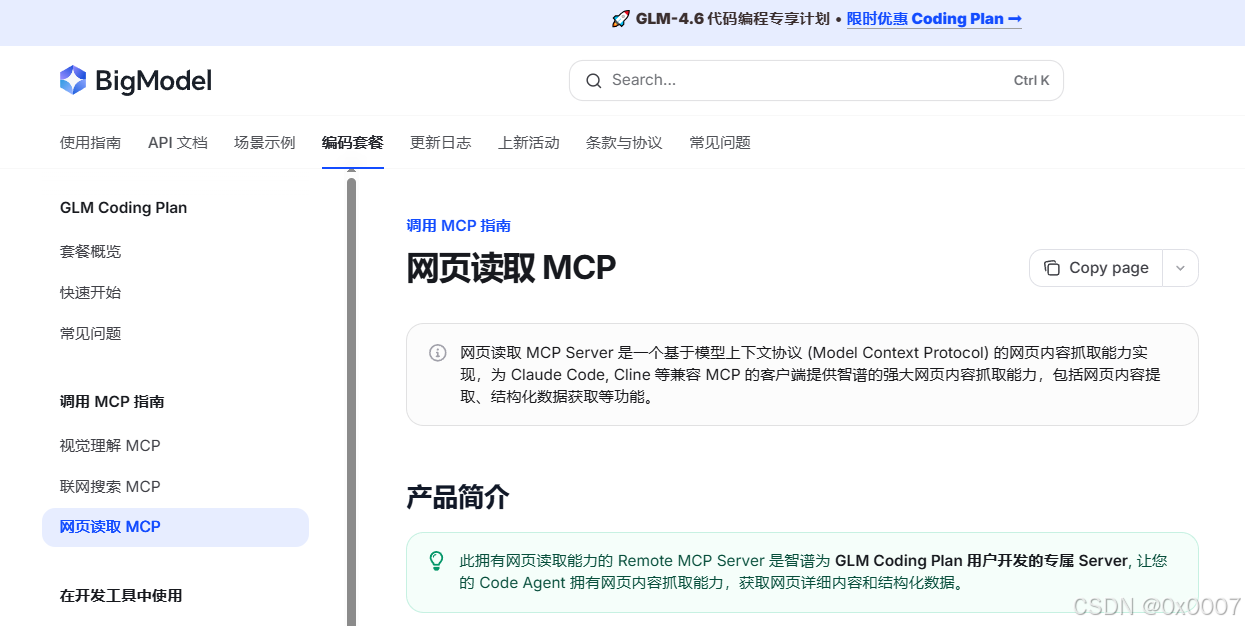 智谱提供了多种 MCP,现在我们要安装的是网页搜索MCP : web-search-prime 和网页读取MCP:web-reader