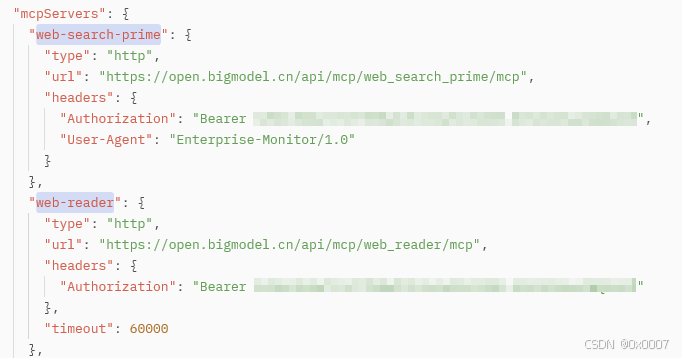 或者手动配置也是可以的,编辑 \.claude.json 配置文件中的 mcpServers 节点,分别增加 web-search-prime、web-reader 子节点即可,注意 Authorization 字段的值,是 Bearer 开头 加你的tooken.
