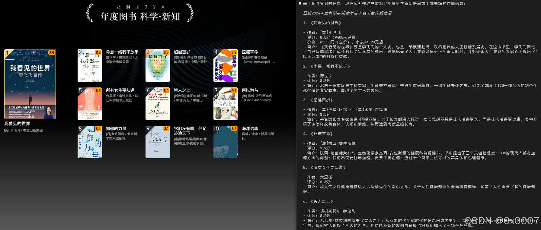 比如,让它搜索豆瓣2024年度读书榜单中的科学新知类下的前十大书籍