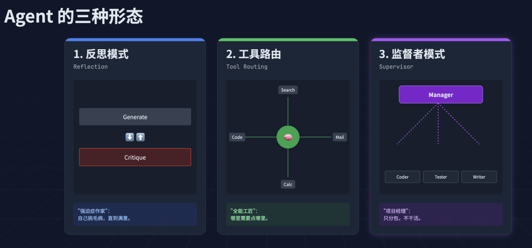 在一个“监督者模式”里,那个负责写代码的“小弟”,它内部可能就是一个“反思模式”的图; 那个负责查文档的“小弟”,它内部可能就是一个“工具路由模式”的图。