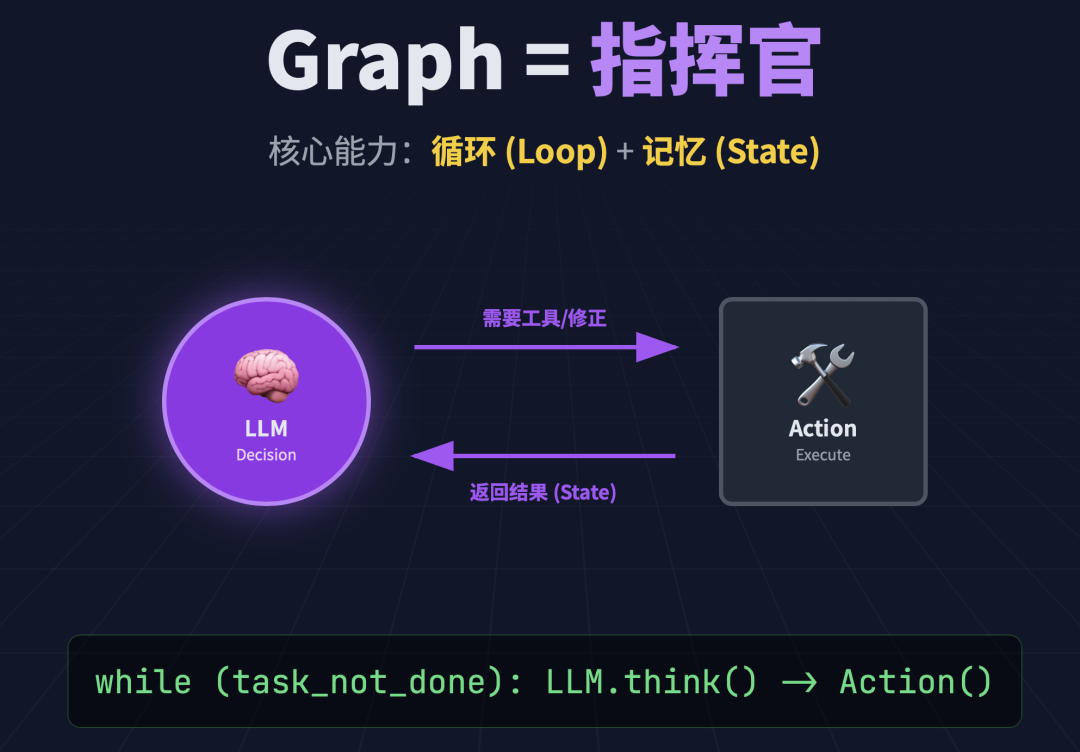 Agent = 大模型 + 循环控制流 + 记忆。 只有具备了这种“循环”和“决策”能力的架构,才配叫真正的 Agent。