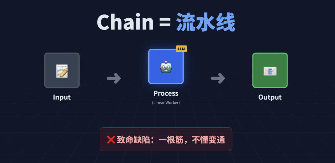 这种架构的优点是稳定,但缺点太致命了——它太死板。 这就好比你雇了个天才,但你只让他拧螺丝。如果中间螺丝滑丝了(大模型出错了),这条 Chain 是不知道变通的,它只会报错。