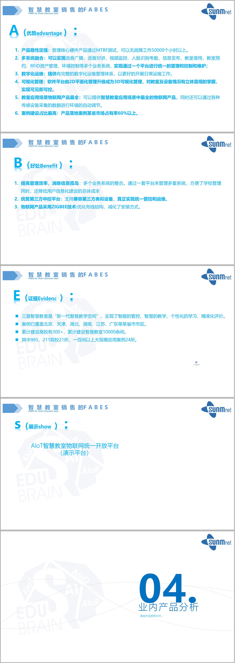 证据(Evidence)部分通过覆盖全国众多省市、累计建设300余所高校、超万间教室,其中包括21所985/211院校和24所百间以上大规模应用案例的事实,增强了说服力。展示(Show)环节则通过实际演示平台来直观呈现产品功能。