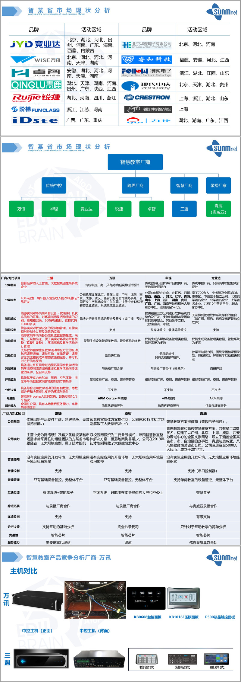 在与万讯的对比中,文件指出三盟的主机采用性能更强的处理器,接口更丰富,控制面板种类更多;综合来看,三盟科技AloT智慧教室物联网统一开放平台以其完整的系统组成、对高等教育机构的深度理解、基于FABES模型的显著优势以及与主要竞争对手相比在硬件集成度、软件平台统一性、数据采集深度、物联网解决方案完整性及互动教学支持等方面的差异化特点,试图在某省市场确立其领先地位。文件重点分析了与万讯、锐捷、青鹿等品
