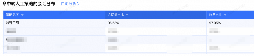 运营人员可以配置拦截策略,命中策略的客户咨询内容,会中断机器人服务,触发转人工请求。如果一段时间内,忽然有大量的转人工请求出现,也可能是因为某个策略异常变动导致,运营Agent也可以发挥能力,做到自动分析识别。