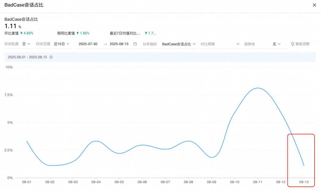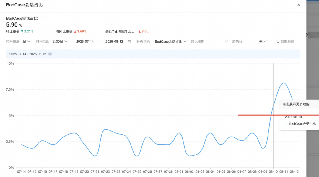 - 举例2,我们在一次运营Agent任务结果中发现BadCase的会话量突然暴增,如下图:
