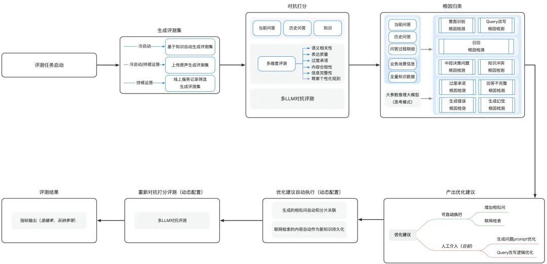 - 首先,评测能力目标的确认,要识别出AI原生客服机器人的回答准确性,对BadCase需要根因的归类,能够对BadCase自动生成优化建议、优化建议具备自动执行的能力。