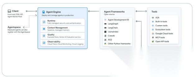 Agent之间的交互: 使用 A2A(Agent2Agent)协议,代理可以通过发布“代理卡”(Agent Card)来被发现,并通过异步任务进行通信。