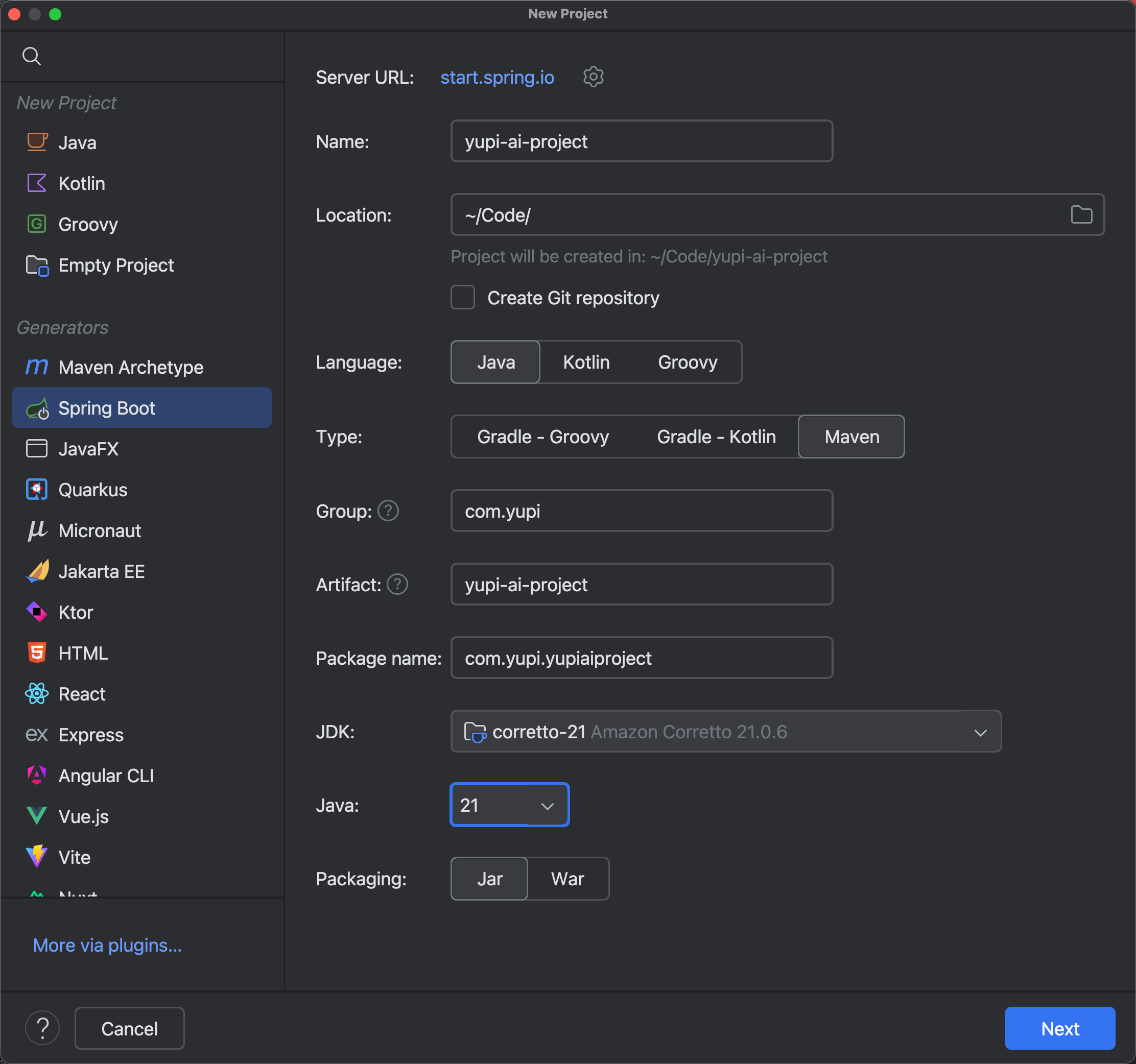 首先利用 IDEA 创建一个 Spring Boot 项目,注意 JDK 版本最好选择 21: