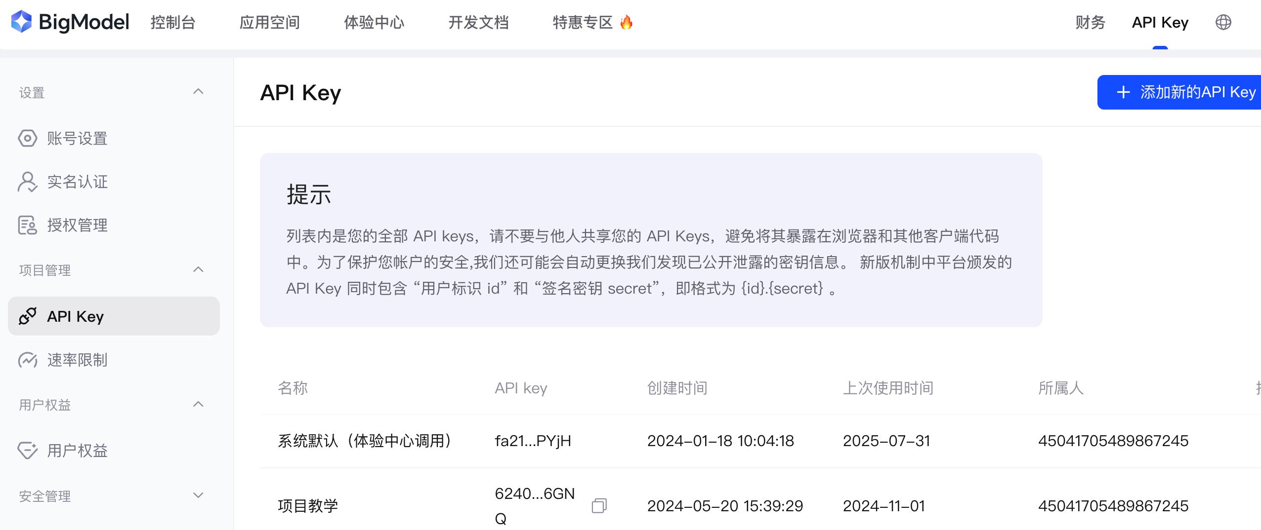 可以在智谱 AI 开放平台获取到 API Key,注意不要泄露!