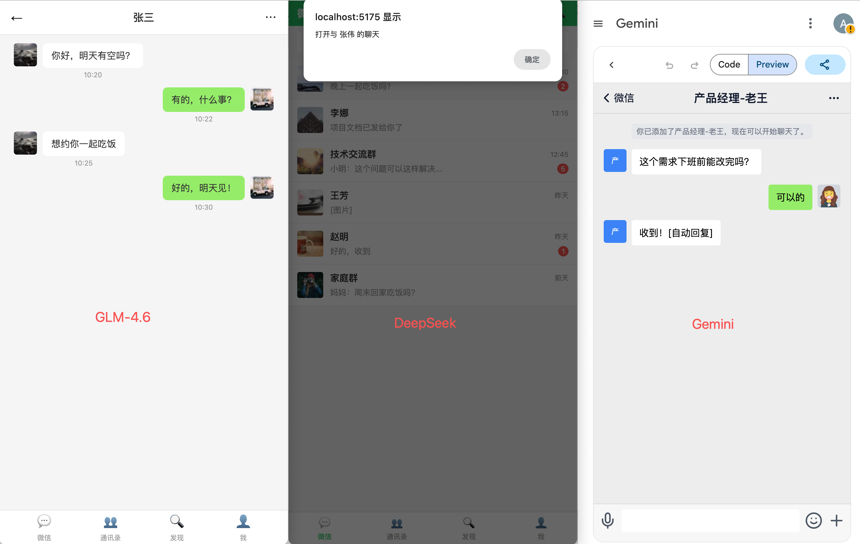 Gemini 3 的还原度是最高的,其次是 GLM-4.6,而 DeepSeek 根本就没有做聊天页面。不过这里我用的是 Gemini 3 的 Canvas 模式,有些图标会自己绘制,而国内的大模型直接用 Emoji 来代替图标了,所以逼真度差了一截。