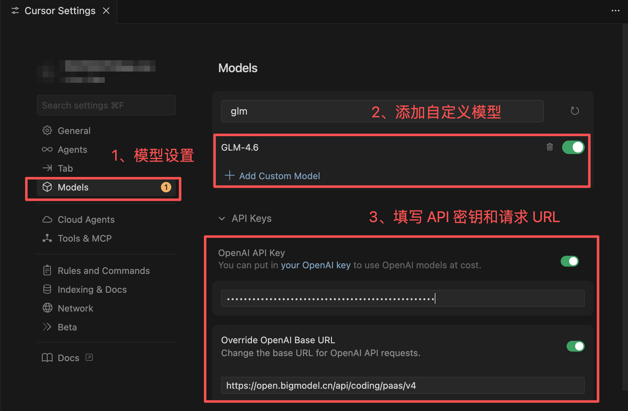 首先打开 Cursor 的设置界面,进入模型设置,然后添加自定义模型,注意名称一定要是大写的 GLM-4.6!