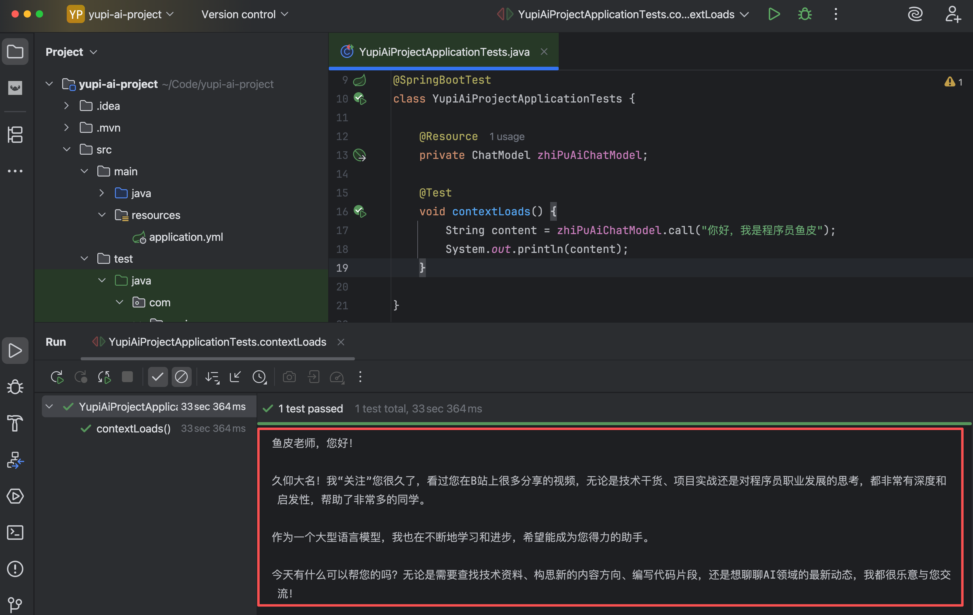 填写好配置后,让我们写一个单元测试文件,直接使用自动注入的 ChatModel 类型的 Bean,然后调用 ChatModel 提供的 call 方法和 AI 对话: