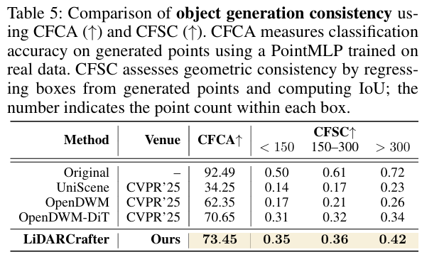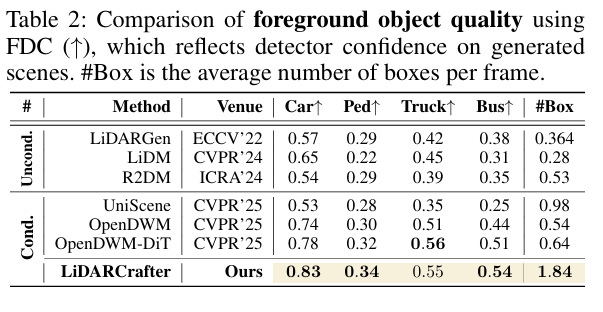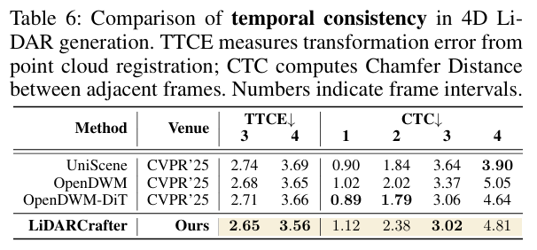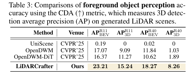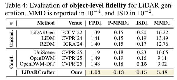 对比主流LiDAR生成基线,LiDARCrafter在关键指标上显著领先: