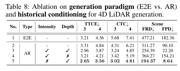 - 自回归(AR)范式优于端到端(E2E):AR在TTCE、CTC等时间指标上更优,契合LiDAR“静态环境为主”的特性;