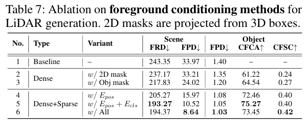 - 稀疏条件(嵌入位置+语义+几何属性)最优,FRD降至194.37、FPD降至8.64,证明目标中心条件的必要性。
