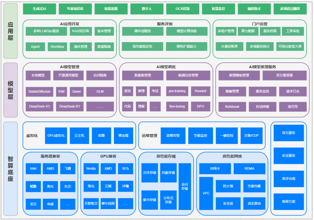 - 智算底座:解决算力、存储、网络、安全这些“基础设施”问题;
